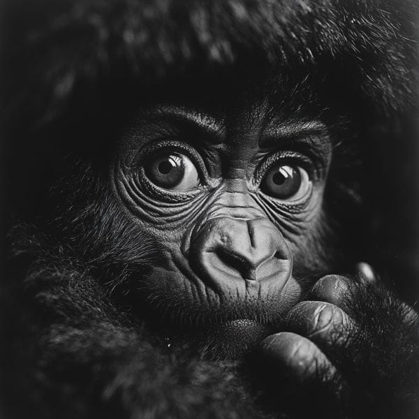 Un gorila bebé en blanco y negro aferrado a su madre_ATAI