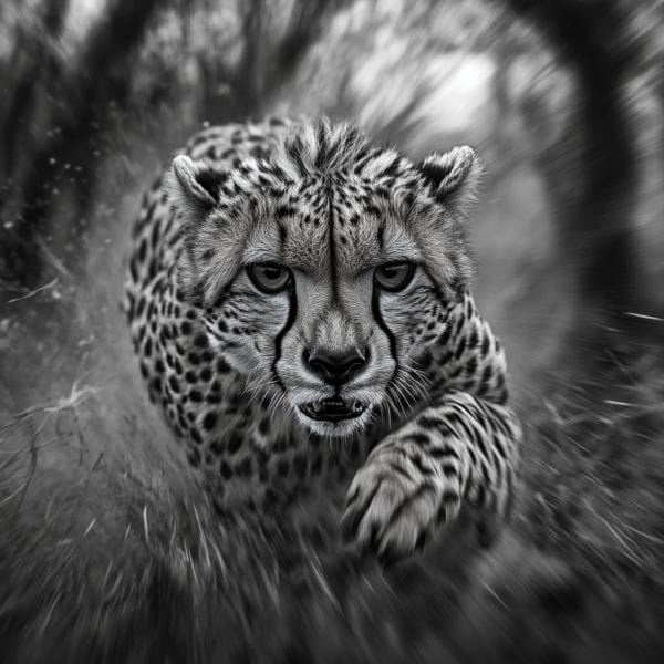 Acción en blanco y negro de un guepardo corriendo_ATAI