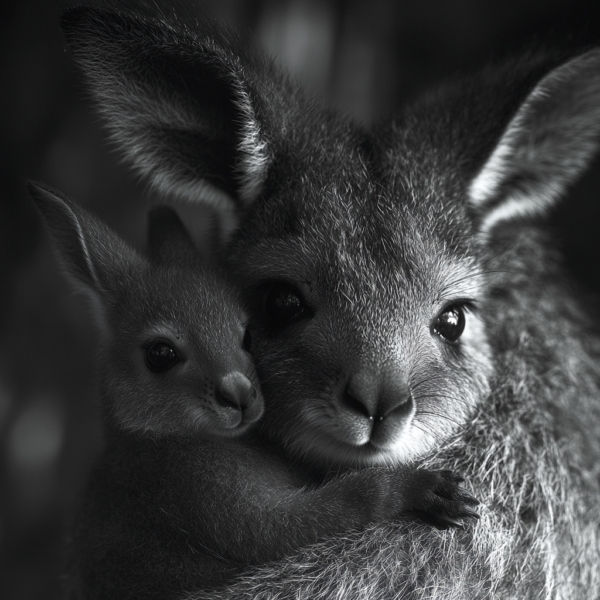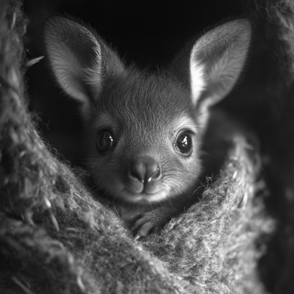 Imagen en blanco y negro de un canguro bebé asomándose curioso_ATAI