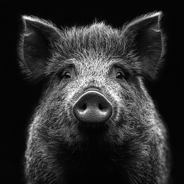 Imagen en blanco y negro de un jabalí salvaje en alerta_ATAI