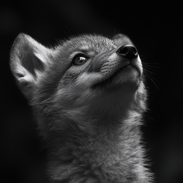 Imagen en blanco y negro de un lobo cachorro explorando_ATAI