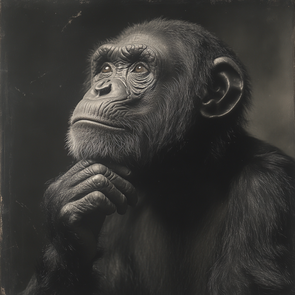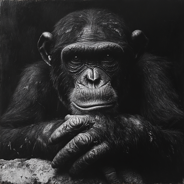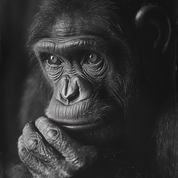 Primer plano en blanco y negro de un chimpancé reflexivo_ATAI
