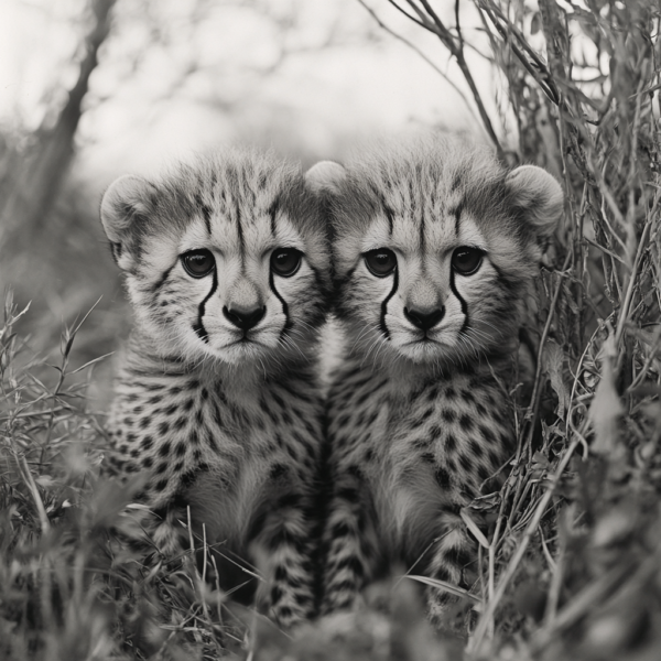 Primer plano en blanco y negro de dos cachorros de guepardo_ATAI