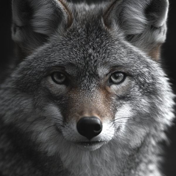 Coyote en blanco y negro, con su rostro y parte superior del cuerpo_ATAI