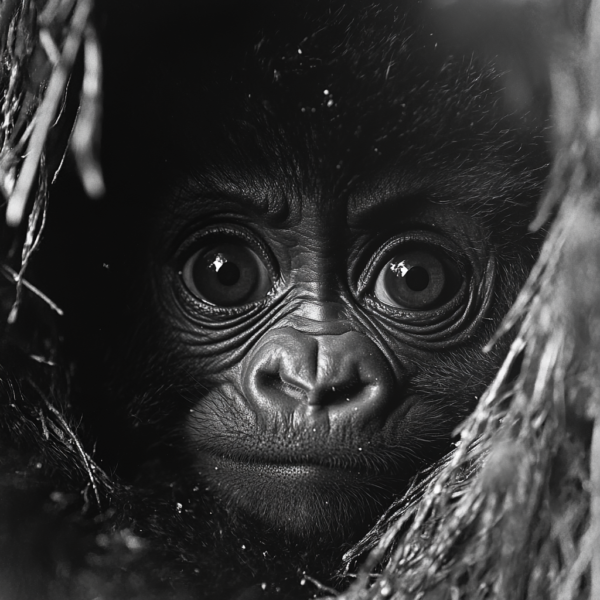 Un gorila bebé en blanco y negro aferrado a su madre_ATAI