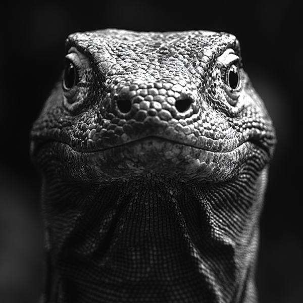 Primer plano en blanco y negro de un dragón de Komodo_ATAI