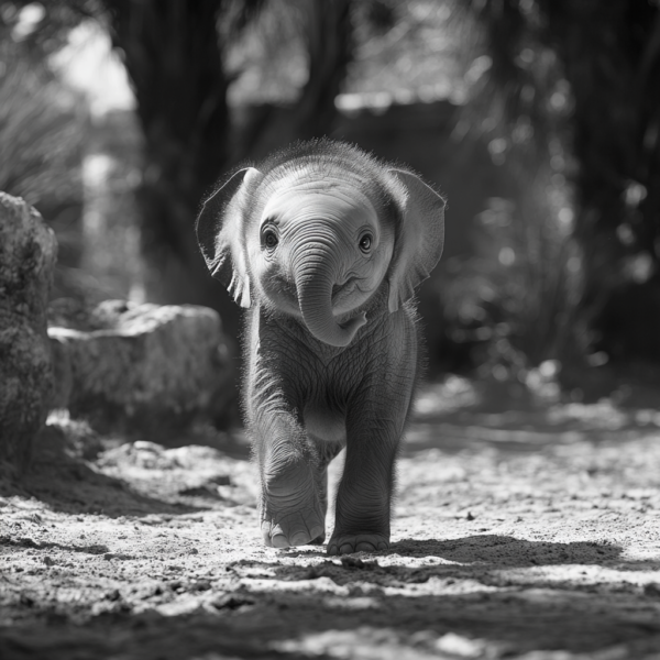 Imagen en blanco y negro de un elefante bebé caminando_ATAI
