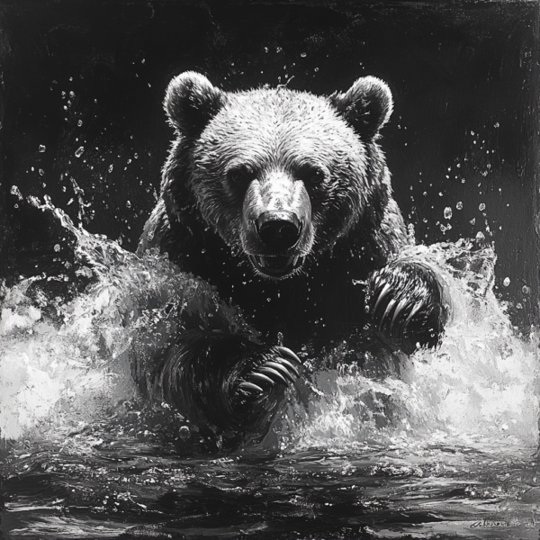Imagen en blanco y negro de un oso cazando peces en el río atento_ATAI