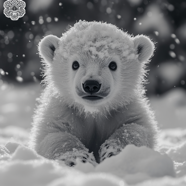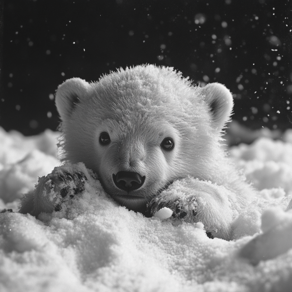 Imagen en blanco y negro de un oso polar bebé jugando travieso_ATAI