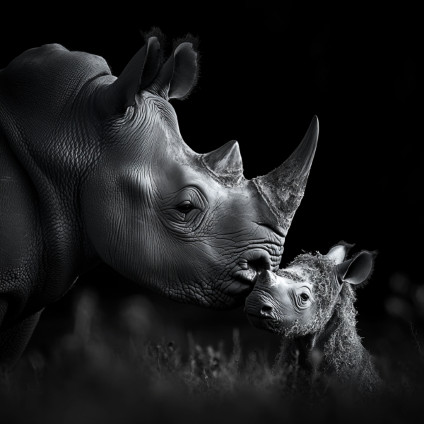 Imagen en blanco y negro de un rinoceronte y su cría_ATAI